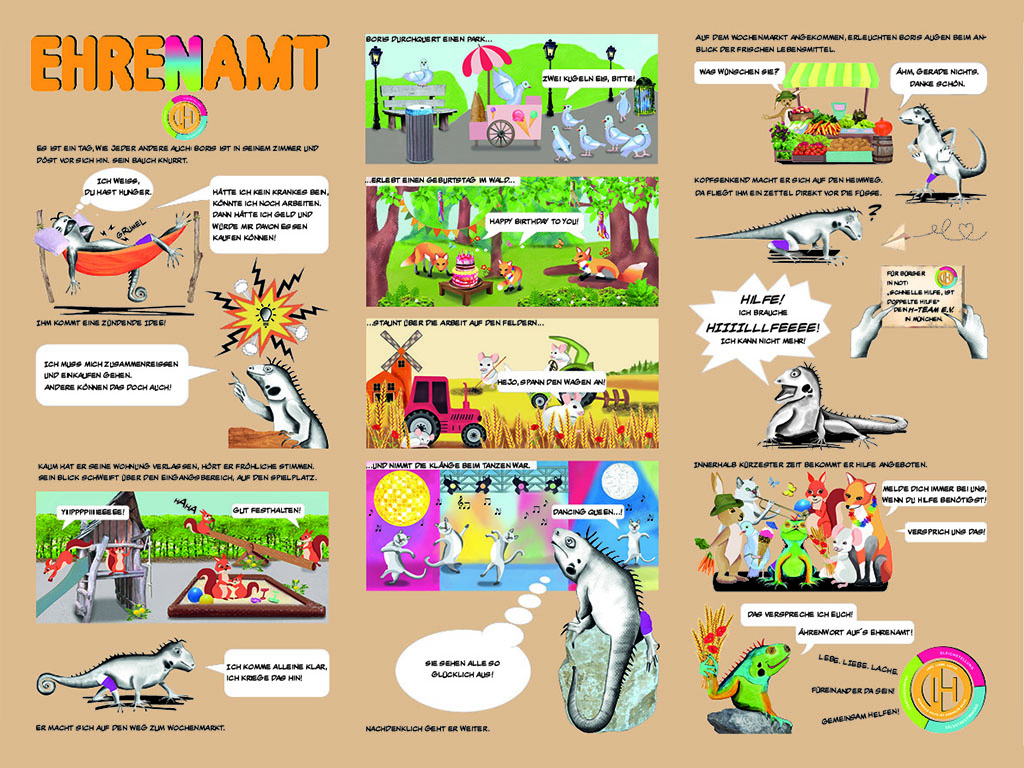 Der Hauptdarsteller der Geschichte zum Thema Ehrenamt ist ein Leguan, symbolisch für einen Münchner Bürger.