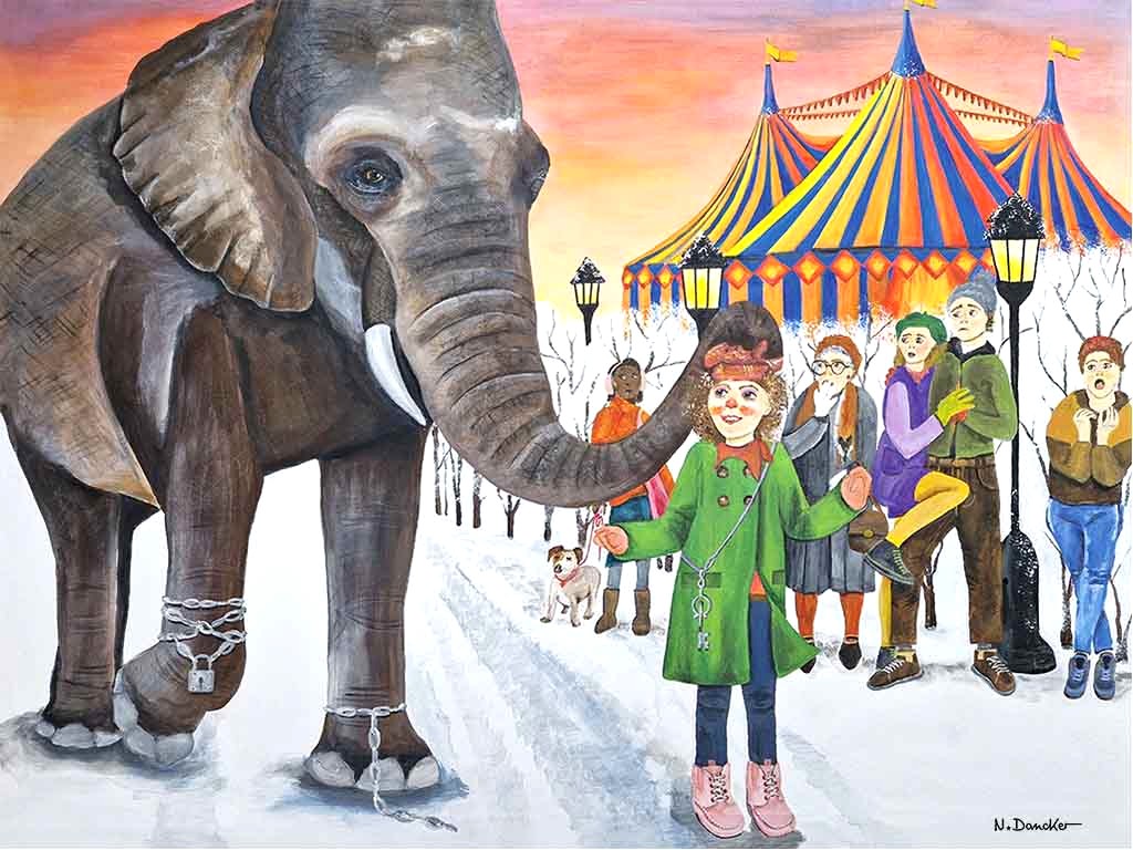 Beschreibung: Zu sehen ist im hinteren Teil des Bildes der bunte Weihnachtszirkus in seiner ansprechenden Farbenpracht. Doch die Idylle trügt, wenn man den vorderen Teil des Werkes im Kontrast sieht: Hier, ist der naturnahe große Elefant abgebildet, der mit Ketten an den Füßen, Fragezeichen aufwirft. Die angstvollen Menschen, an der rechten Bildseite zeigt die für sie furchterregende Szene auf… wobei dies nicht zu verstehen ist, weil sie ja die potenziellen Zirkusbesucher darstellen. Das Mädchen im Vordergrund hat durch seine freundlich hochgezogenen Mundwinkel ein fröhliches Erscheinungsbild. Sie scheint im Zirkus eine Clownrolle zu haben, zumindest deuten ihre bemalten Wangen darauf hin. Außerdem hat sie den Schlüssel für die Fußketten um den Körper, was bedeutet, dass sie dem Elefanten die Freiheit geschenkt hat. Sie freut sich einfach für ihn.