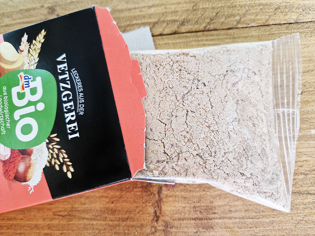 Verpackung: Umverpackung aus Pappe, Fertigmischung in Plastik.