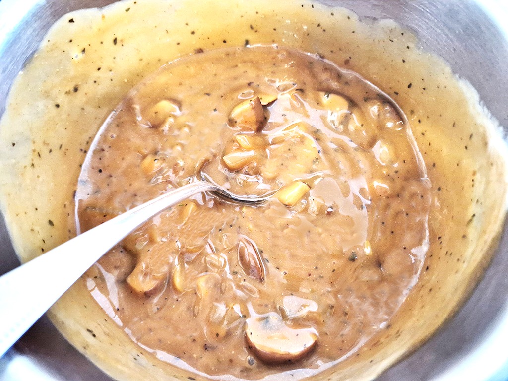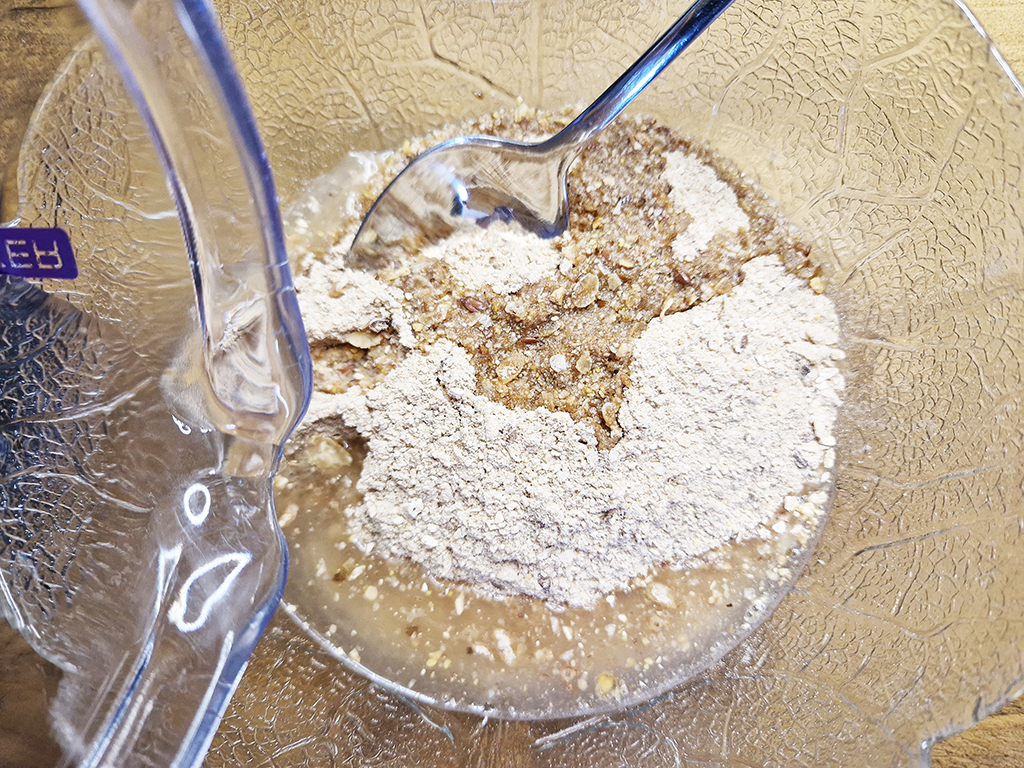 Die Zubereitung der Bratlinge gestaltet sich recht einfach: Der Packungsinhalt wird in Wasser eingerührt und bei uns mit einer fein gehackten Zwiebel, frischer Petersilie und eigenem Chilipulver zu einem Teig verarbeitet. Dann darf der Bratlingteig etwas durchziehen.