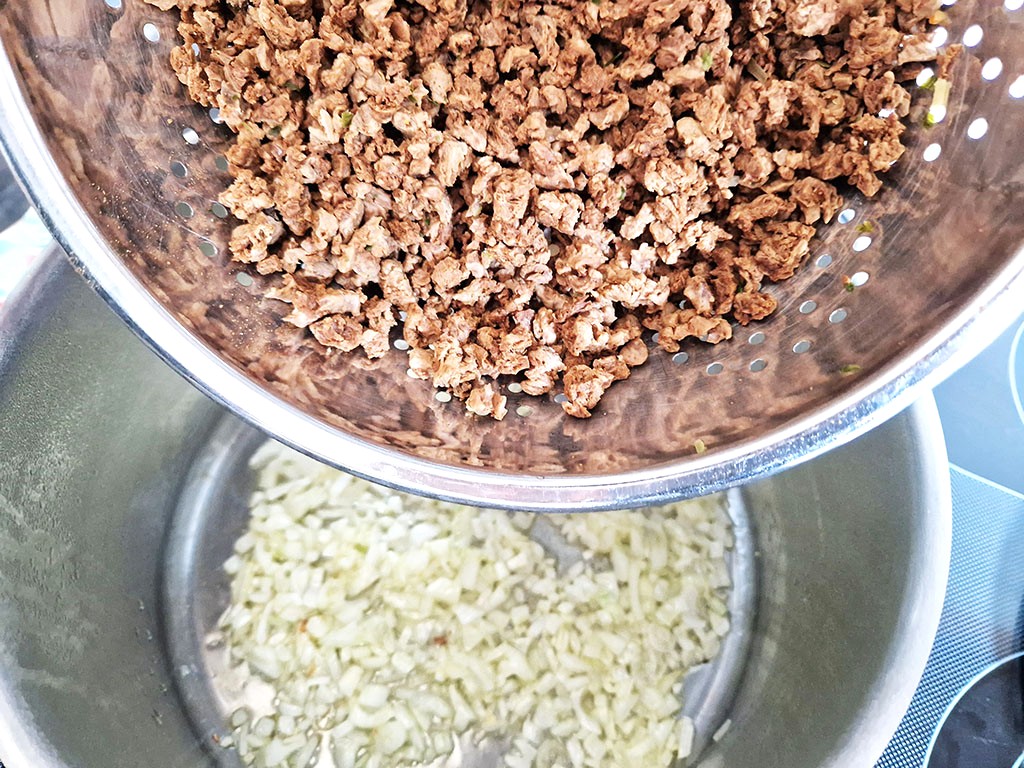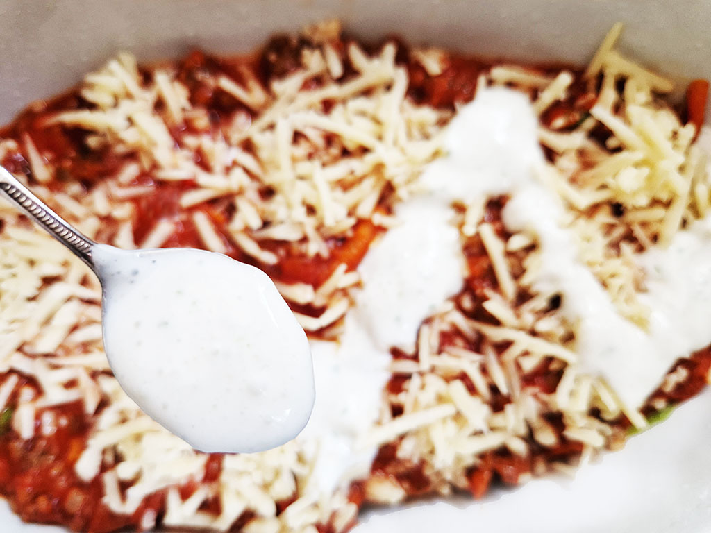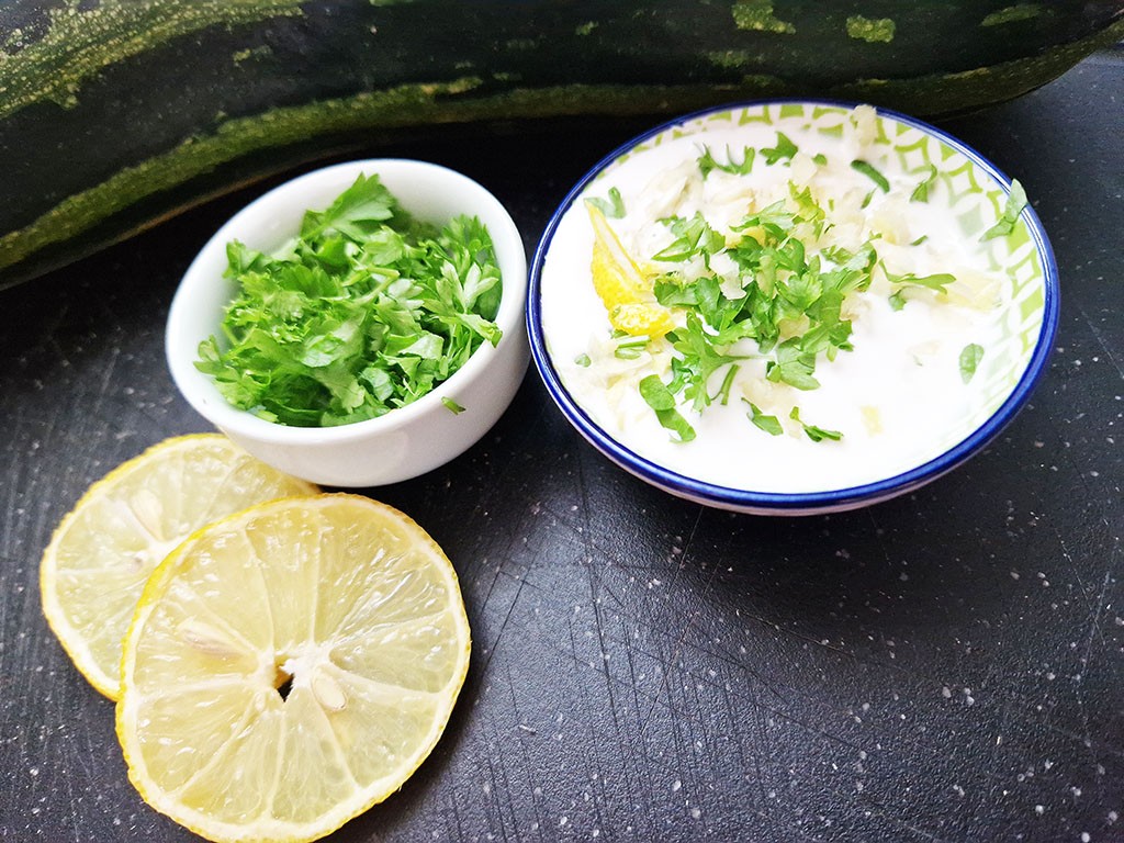 Parallel dazu bereiten wir die Sour Cream aus pflanzlichem Joghurt, Olivenöl, Zwiebeln und Knoblauch vor und der werte Herr Gemahl gibt noch Chili-Flocken hinzu: Für die gewisse Schärfe. ツ
