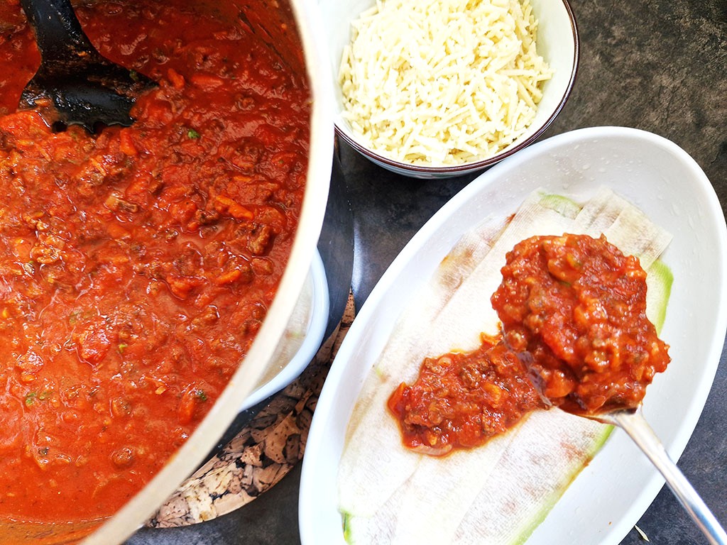 Auf die untere Hälfte vom Kürbiskernbrötchen streichen wir also den Chili-Dip und fügen ganz nach unserem Geschmack frische Salatblätter, Tomaten, Gewürzgurken und Zwiebelringe hinzu, um die Grundlage vom Burger zu schaffen.