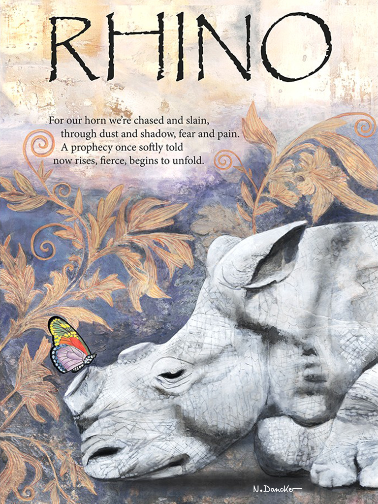 Mein Bild zeigt ein enthorntes Nashorn. Der Betrachter fühlt den Schmerz, kennt aber nicht dessen momentanen Zustand, in welchem sich das Nashorn befindet. Auf dem abgesägten vorderen Horn sitzt ein Schmetterling. Schmetterlinge symbolisieren Transformation, Neuanfang, Leichtigkeit und die Seele. Die Kraft, welches das Nashorn symbolisch hier und jetzt benötigt! ♡