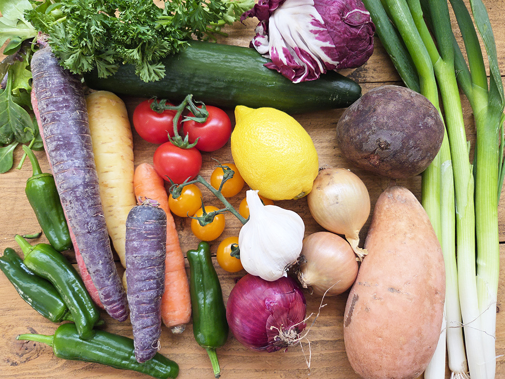 Unser heutiger Gemüsewarenkorb beinhaltet grünen Salat, Radicchio, Tomaten, Gurke, Karotten, Bratpaprika, Rote Bete, Lauchzwiebeln, Süßkartoffel, Zwiebeln, Knoblauch, Kräuter und Zitrone.