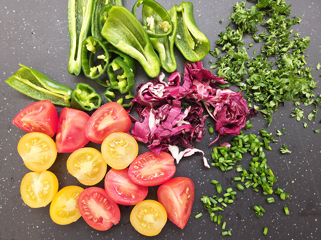 Das Gemüse für den Salat schneiden wir mundgerecht klein.
