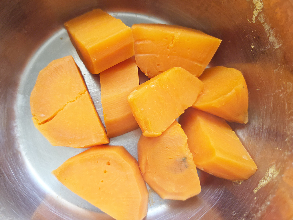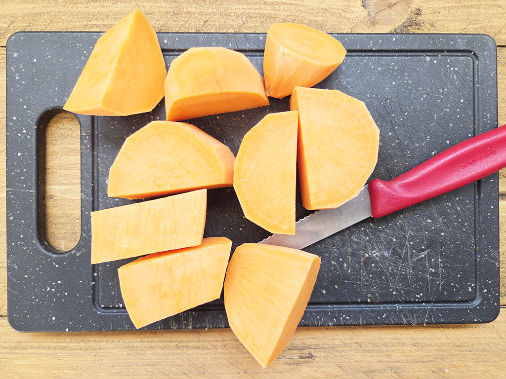 Für das Püree waschen, schneiden und teilen wir die Süßkartoffel in Spalten…