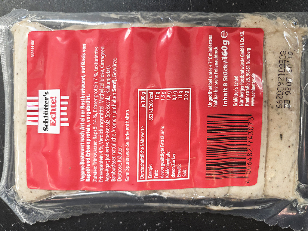 „Gewohnt köstlich mit viel Schlütter’s Echte! Rostbratwurst-Geschmack. Eine echte Alternative für alle Vegetarier und Veganer – oder einfach mal zum Ausprobieren…“