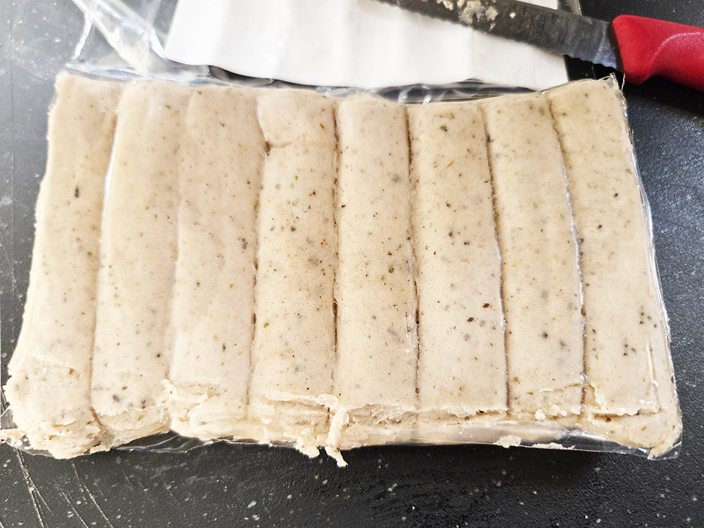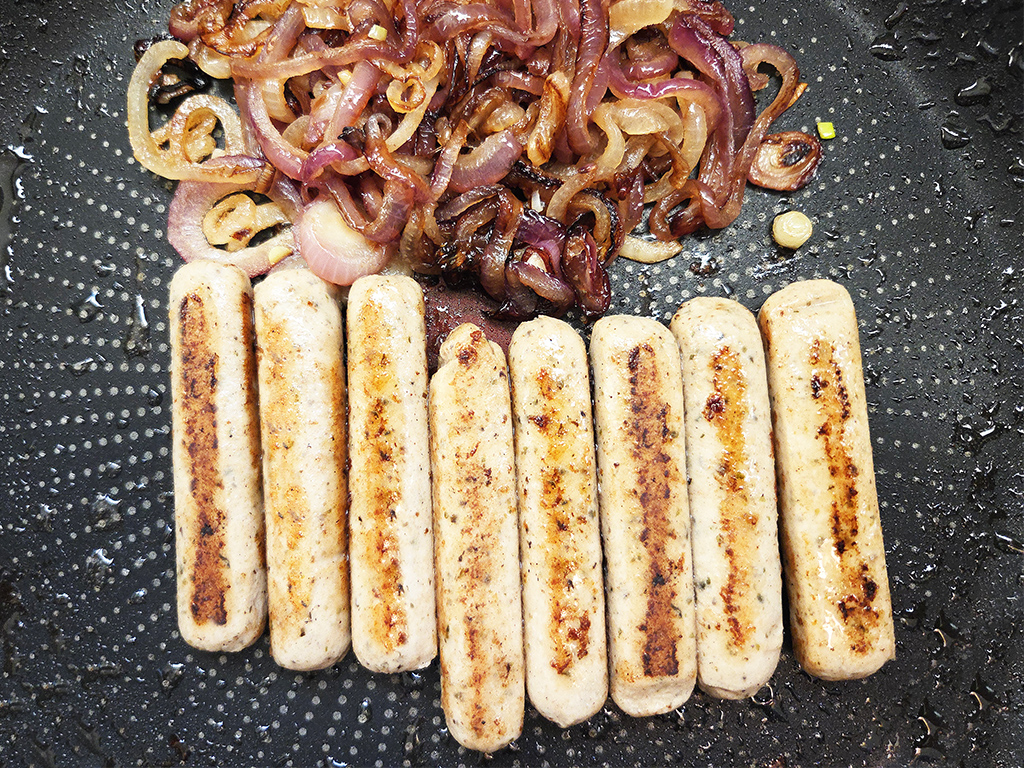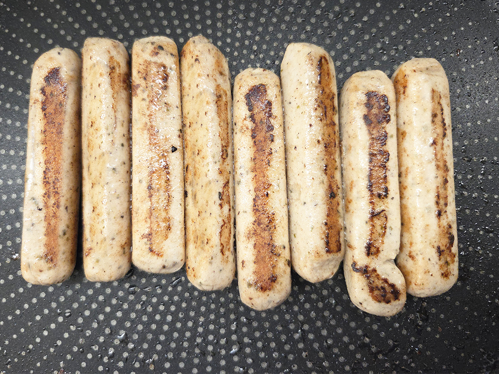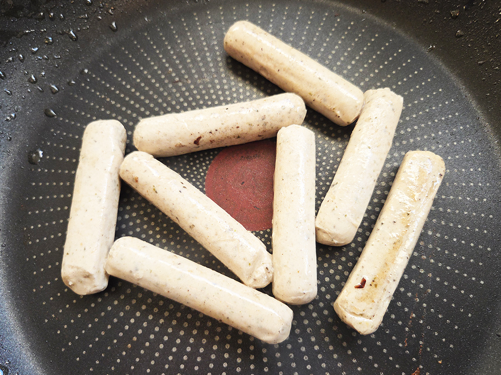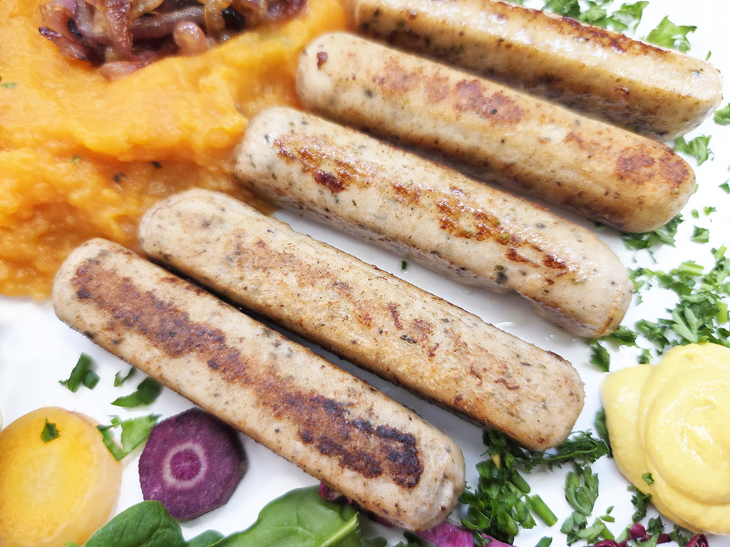 Beschreibung: Pflanzliche Mini-Bratwürste nach Art einer Rostbratwurst