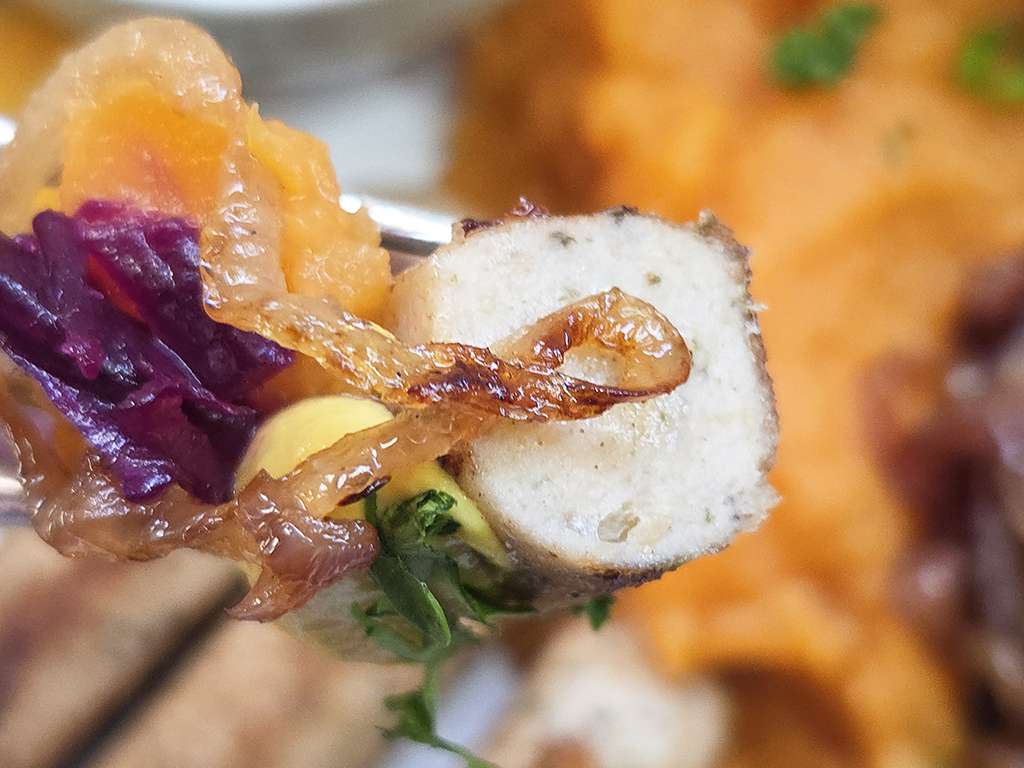 Kleine Rostbratwürste zu Süßkartoffelpüree und Rotkohlsalat