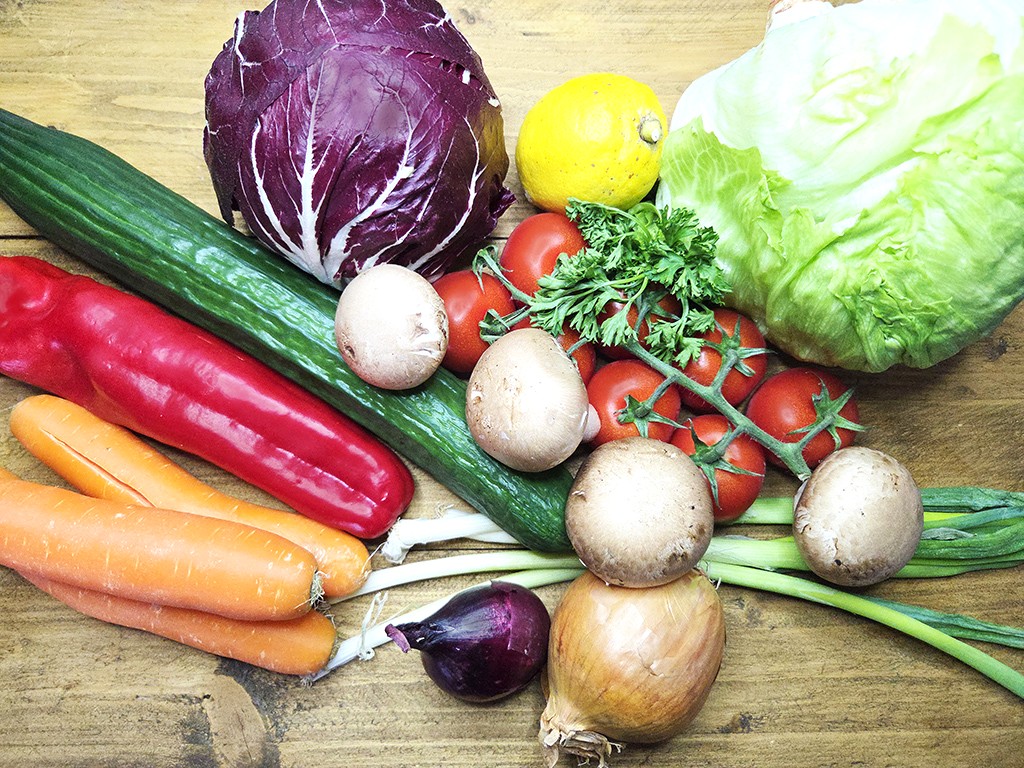 Unser heutiger Gemüsewarenkorb beinhaltet Salat, Radicchio, Tomaten, Gurke, Paprika, Karotten, Champignons, Zwiebeln, Petersilie, Lauchzwiebeln und Zitrone.