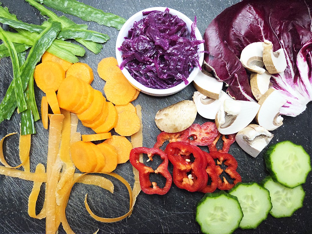 Das Gemüse für den Salat schneiden wir mundgerecht klein und bereiten daraus einen Salat zu. Für die spätere Champignon-Sauce schneiden wir die Karotten in Scheiben und vierteln die Pilze. Außerdem steht der Rotkohl bereit, den wir in einem Topf noch mit weihnachtlichen Gewürzen, wie Zimt und Sternanis, versehen und erwärmen.