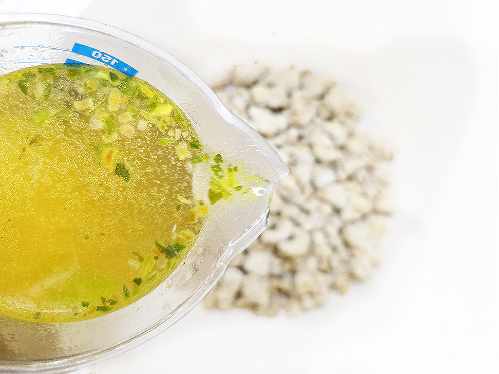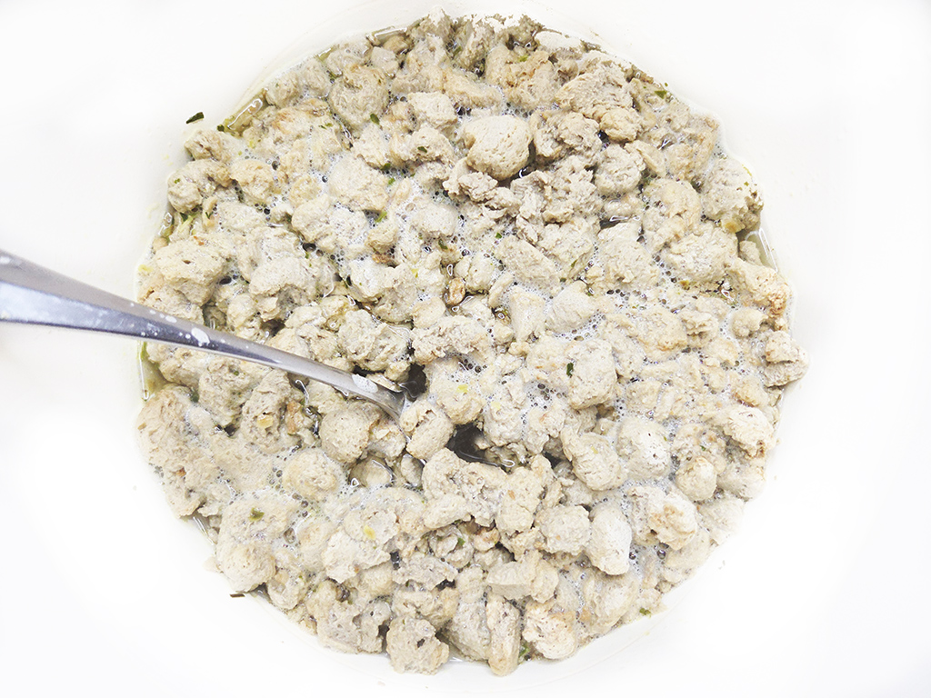 Die Chunks müssen nur kurz in Wasser eingeweicht werden. Deshalb übergießen wir die 76 g Sunflower-Chunks mit aufgewärmter Gemüsebrühe.