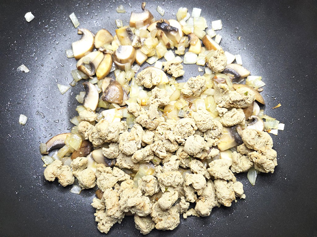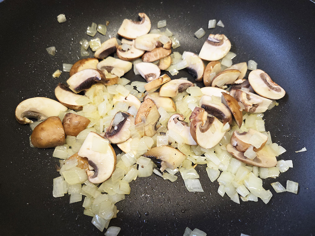 Die Zwiebeln braten wir in etwas Öl kross in einer Pfanne an, geben dann die geviertelten Champignons hinzu…