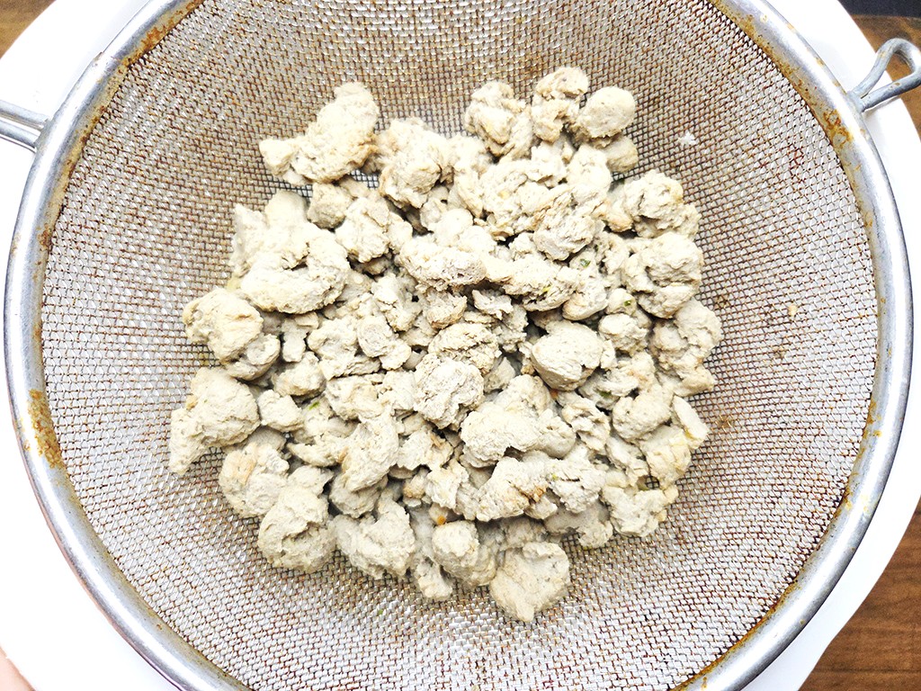 Dann gießen wir alles in einem Sieb ab und drücken die Chunks leicht aus, damit sie eine trockenere Oberfläche erhalten.