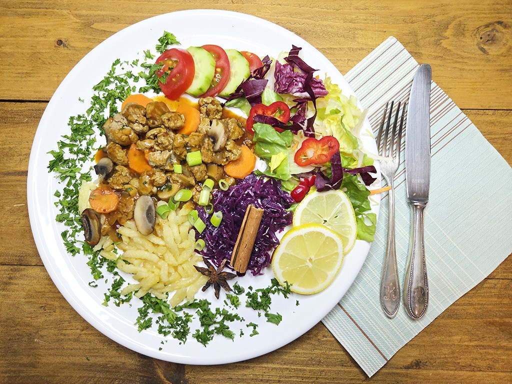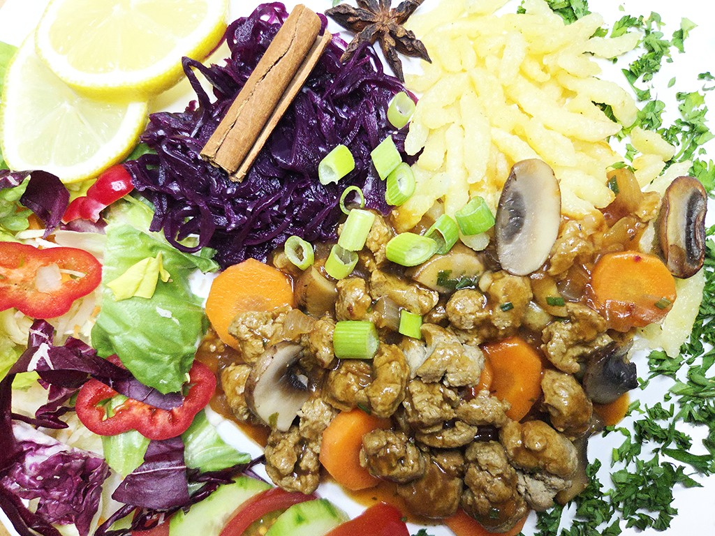 Zum Servieren die SunflowerChunks von SunflowerFamily mit der Champignon-Rahmsauce, dem Rotkohl und den Spätzle anrichten und nach Belieben mit dem bunten Salat und Zitronenscheiben ergänzen.