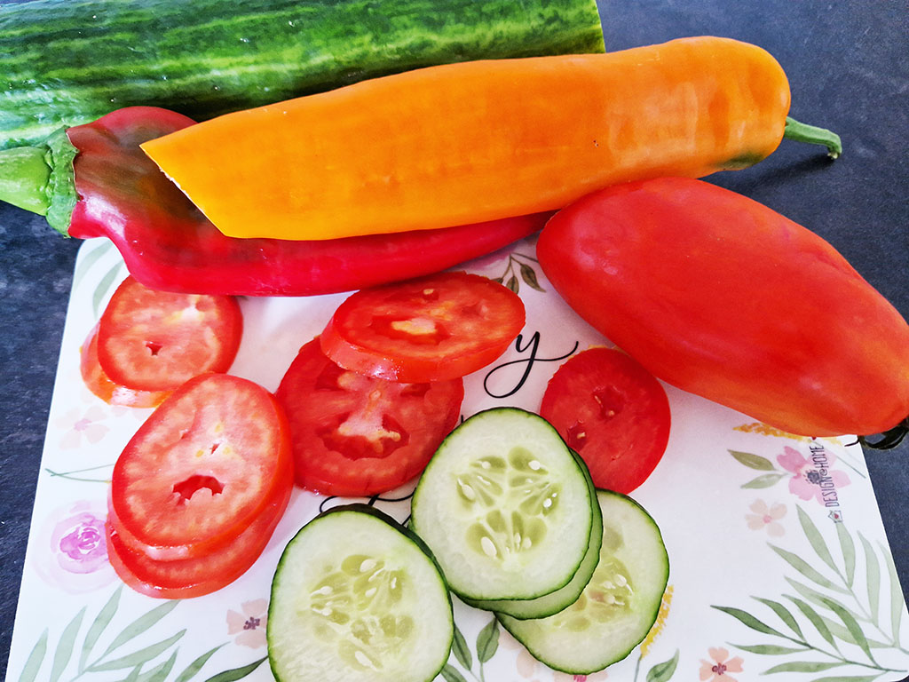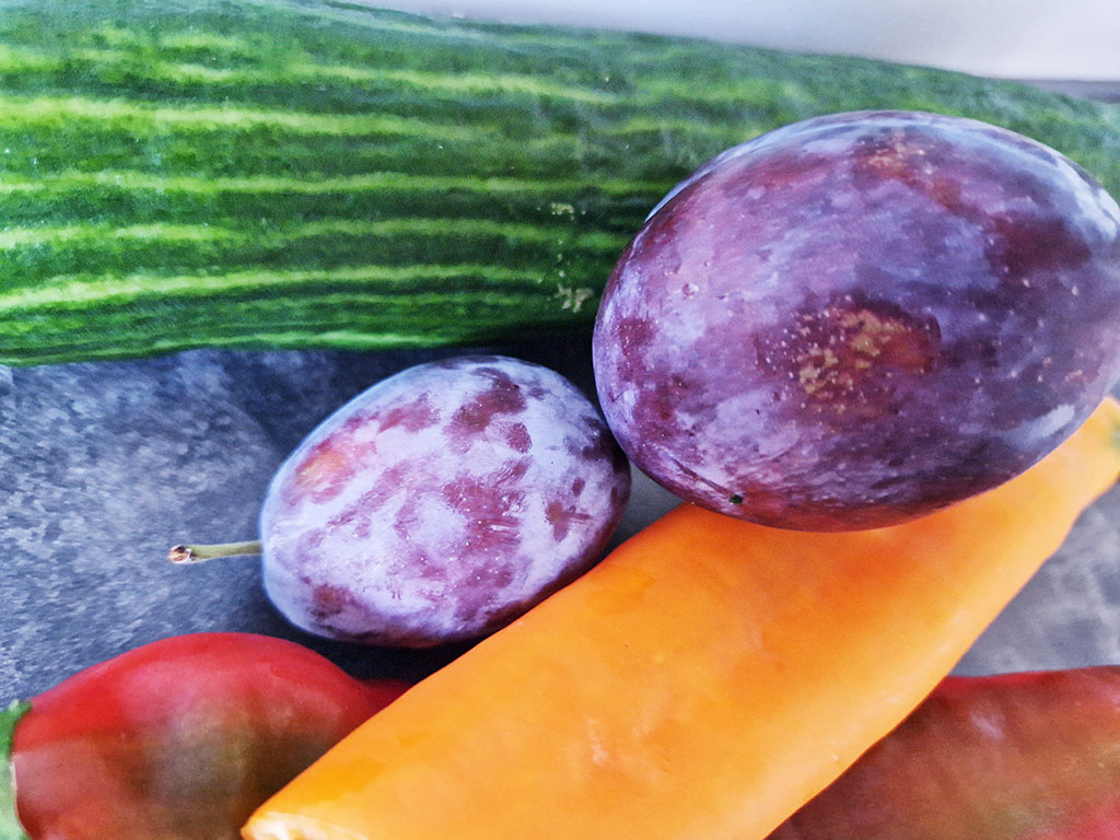Die beiden Zwetschgen hat mein lieber Mann an unserem Gemüsestand geschenkt bekommen. Diese werden wir mit in den Salat geben.