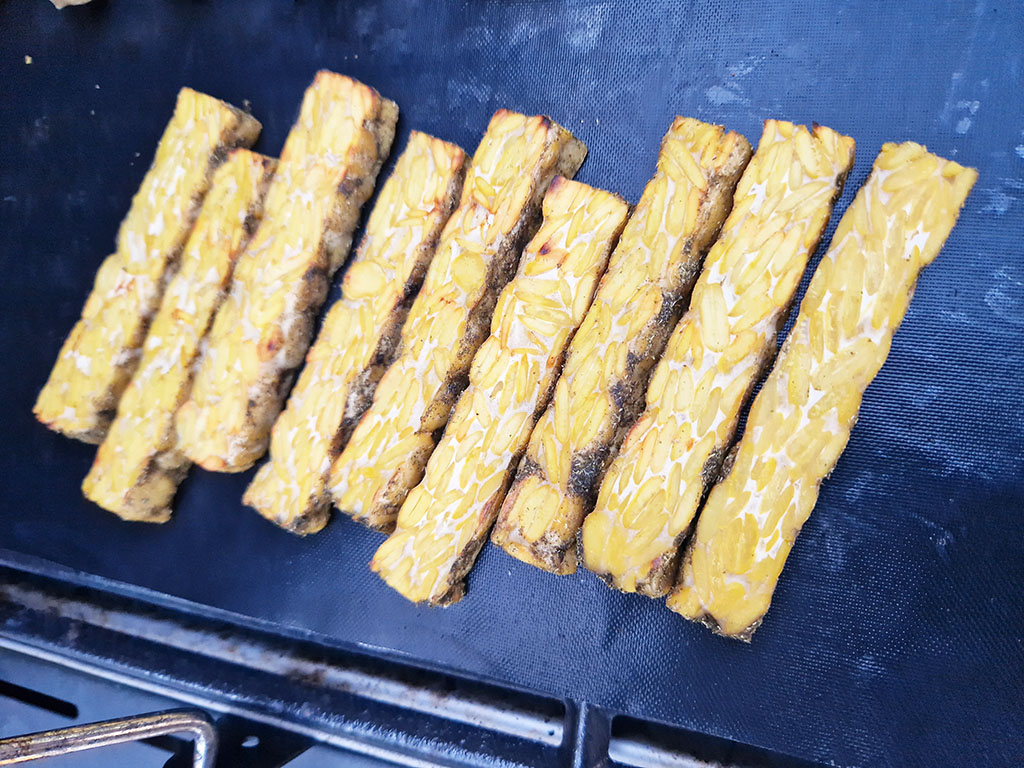 Den Kräuter-Tempeh schneiden wir in nicht zu dünne Streifen.
