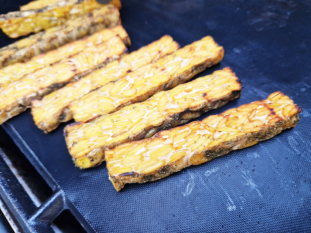 Beim Anschnitt ist das typische Tempehmuster deutlich zu sehen.