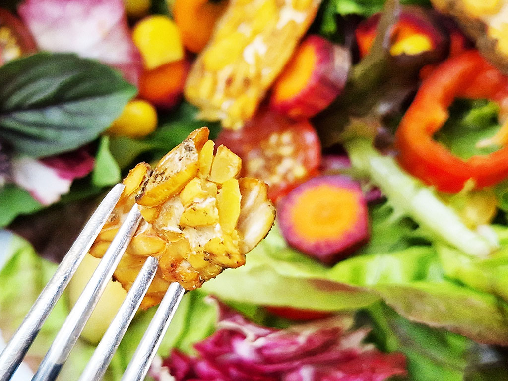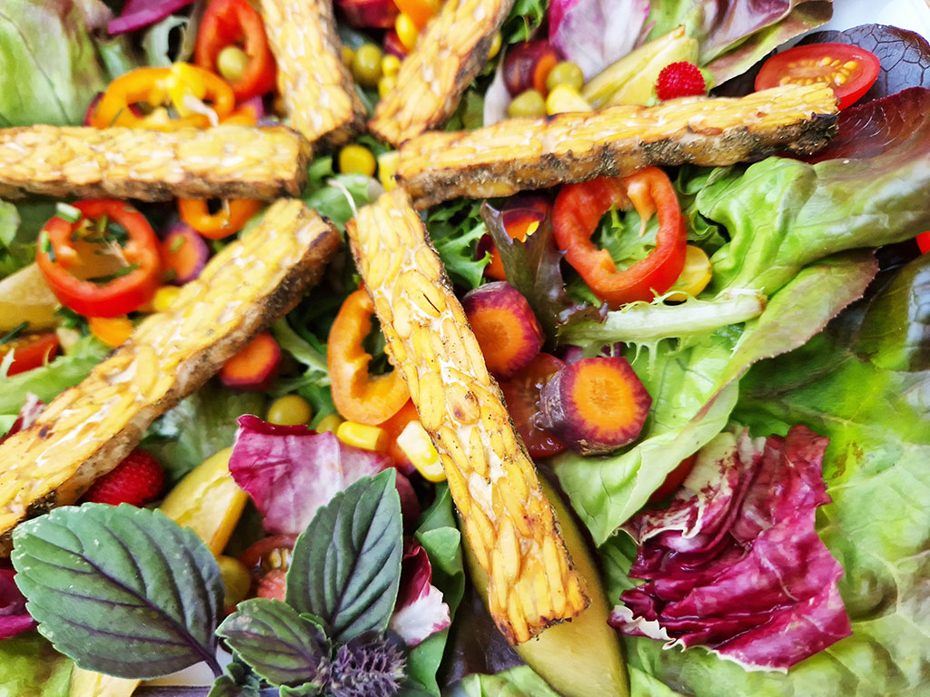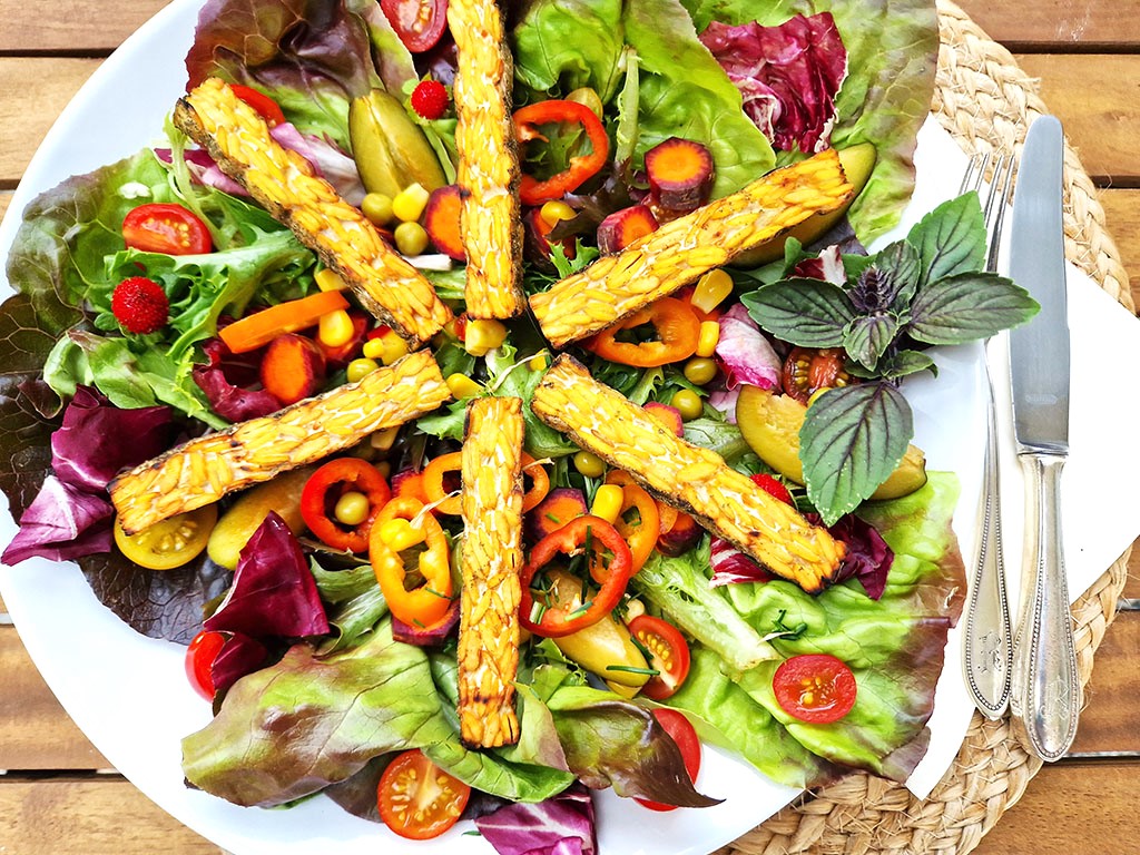 Lupinen-Wildkräuter-Tempeh auf buntem Salatbeet