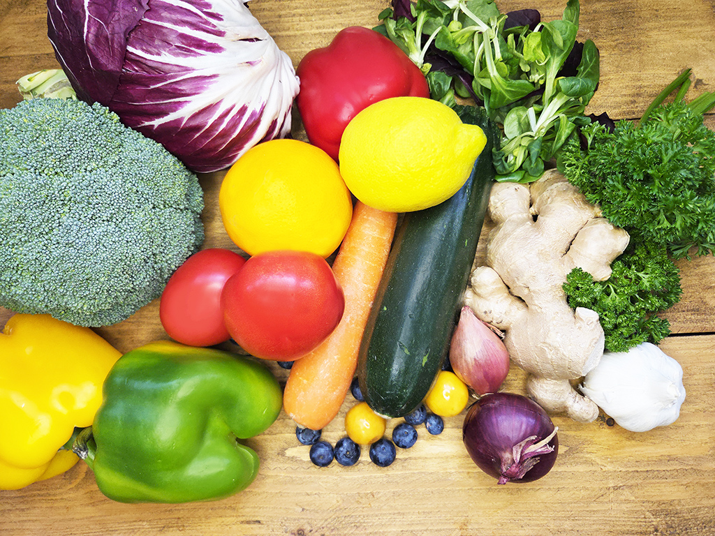 Unser heutiger Gemüsewarenkorb beinhaltet grünen Salat, Radicchio, Tomaten, Gurke, Karotten, Lauchzwiebeln, Paprika, Zwiebeln, Ingwer, Brokkoli, Blaubeeren, Knoblauch, Kräuter und Zitrone.