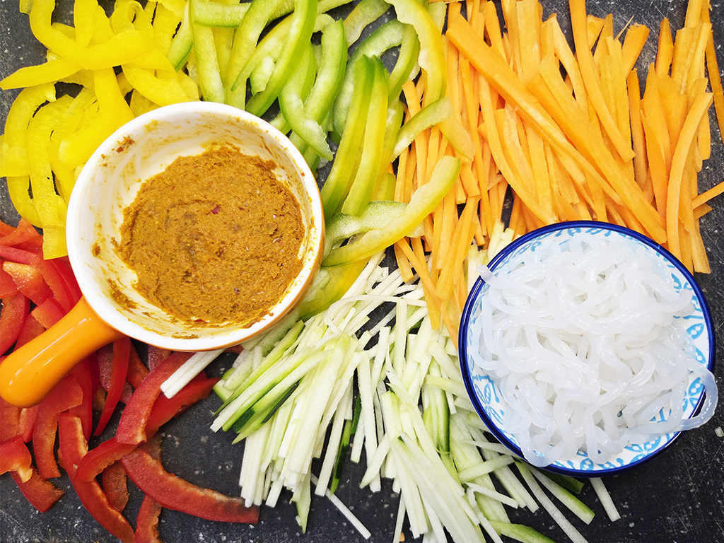 Das Gemüse für den Salat schneiden wir mundgerecht klein, das Gemüse für das spätere warme Gericht eher ganz fein in Streifen. Dazu gibt es Konjaknudeln und eine selbst kreierte Currypaste.