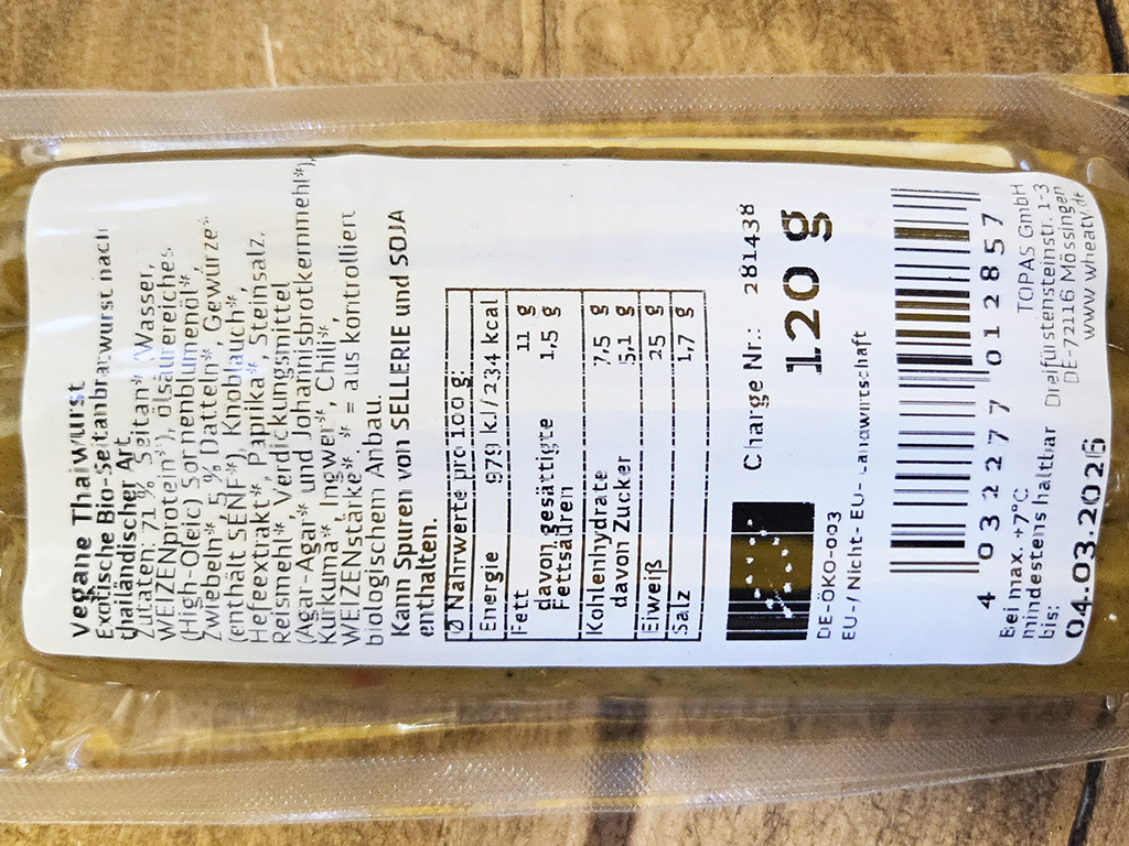 Hier ist die Originalverpackung der Bio Thai-Wurst der Marke Wheaty zu sehen. Das ist die Verpackung, in denen die Würste vakuumiert wurden.