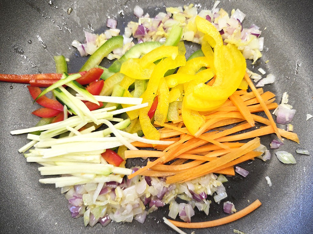 Das Gemüse mit den Zwiebeln, dem Knoblauch und dem Ingwer in einer mit Öl benetzten Pfanne anbraten. Mit Gemüsebrühe ablöschen.