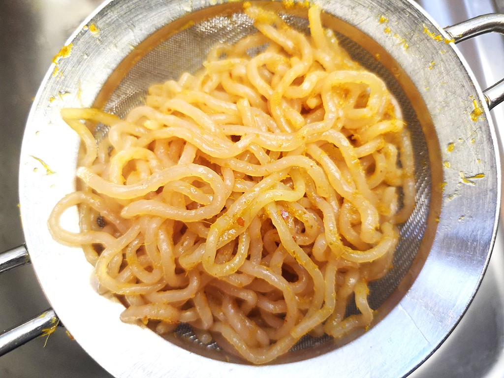 …und gießen sie nach dem erreichten Garpunkt in einem Sieb ab. Ihr seht, dass die Nudeln den Farbton der Currypaste ganz wunderbar angenommen haben. Damit punkten wir farblich und bestimmt auch kulinarisch.