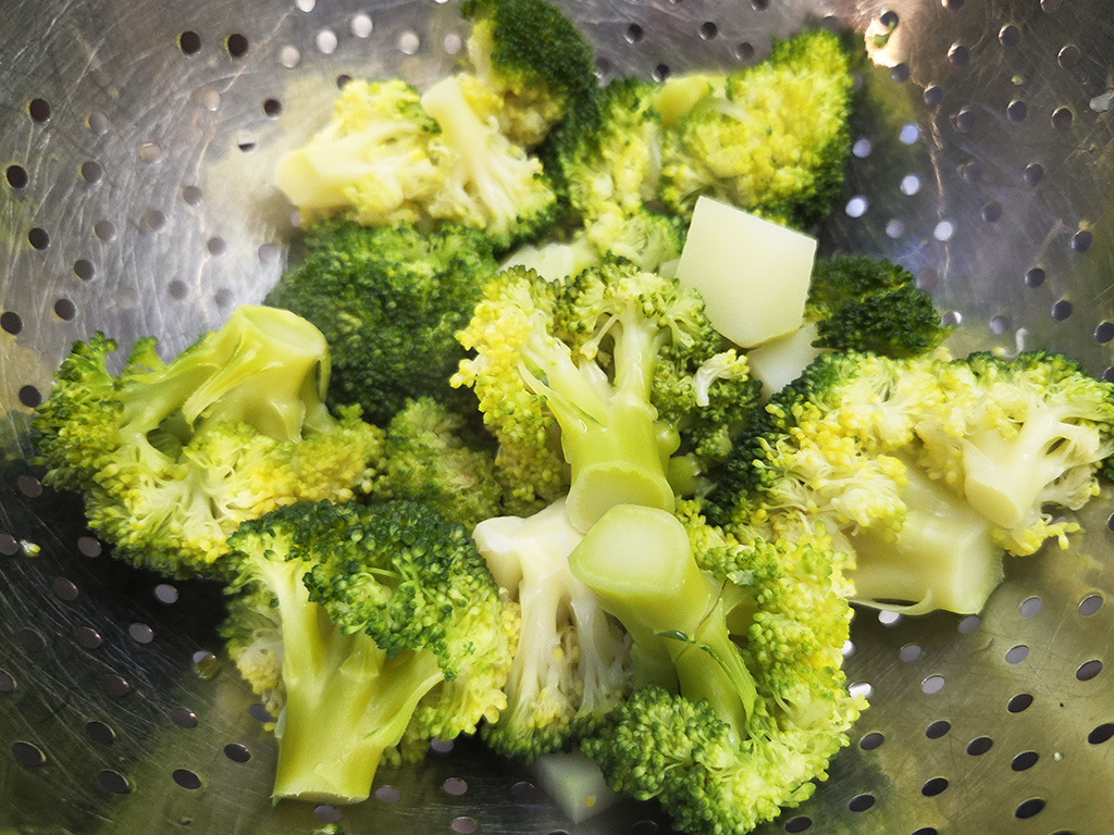 Den Brokkoli waschen wir, schneiden ihn klein und verwenden dabei auch den Strunk. Dann garen wir ihn in heißer Gemüsebrühe gar und lassen ihn dann in einem Sieb abtropfen.