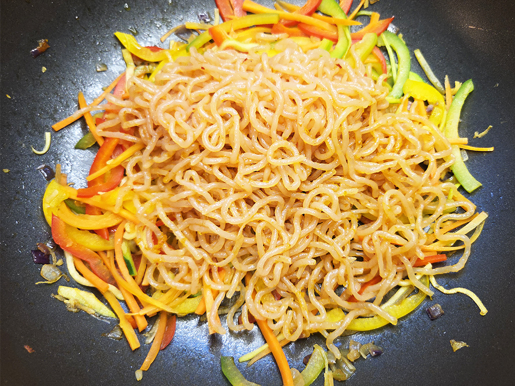 Zu dem gegarten Gemüse, welches die Gemüsebrühe nun aufgesogen hat, geben wir unsere Curry-Nudeln. Alles verrühren und bei Bedarf mit Salz und Pfeffer nachwürzen.