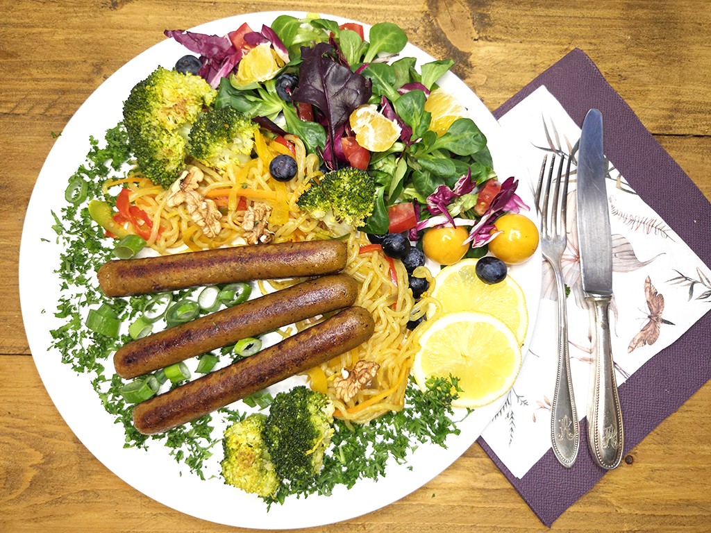 Zum Servieren die Bio Thai-Wurst auf dem Teller anrichten und nach Belieben mit den würzigen Gemüse-Konjaknudeln und dem Brokkoli ergänzen. Salat mit Blaubeeren und Zitronenescheiben beifügen. Nun einfach genießen!
