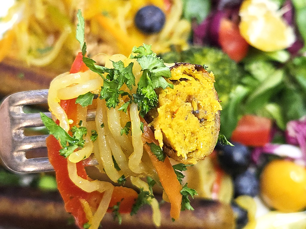 Thai-Wurst in würzigen Gemüse-Konjaknudeln mit Brokkoli